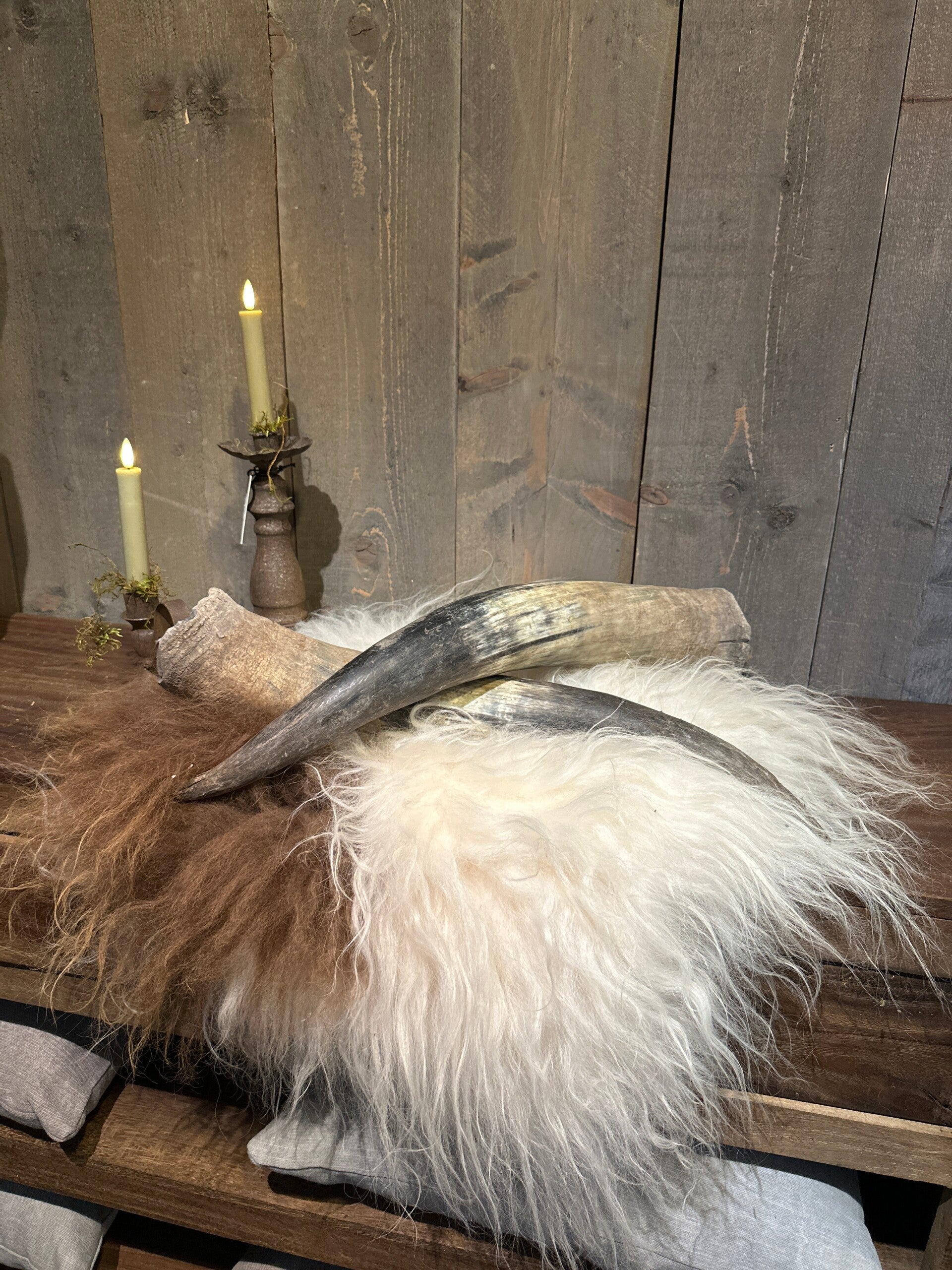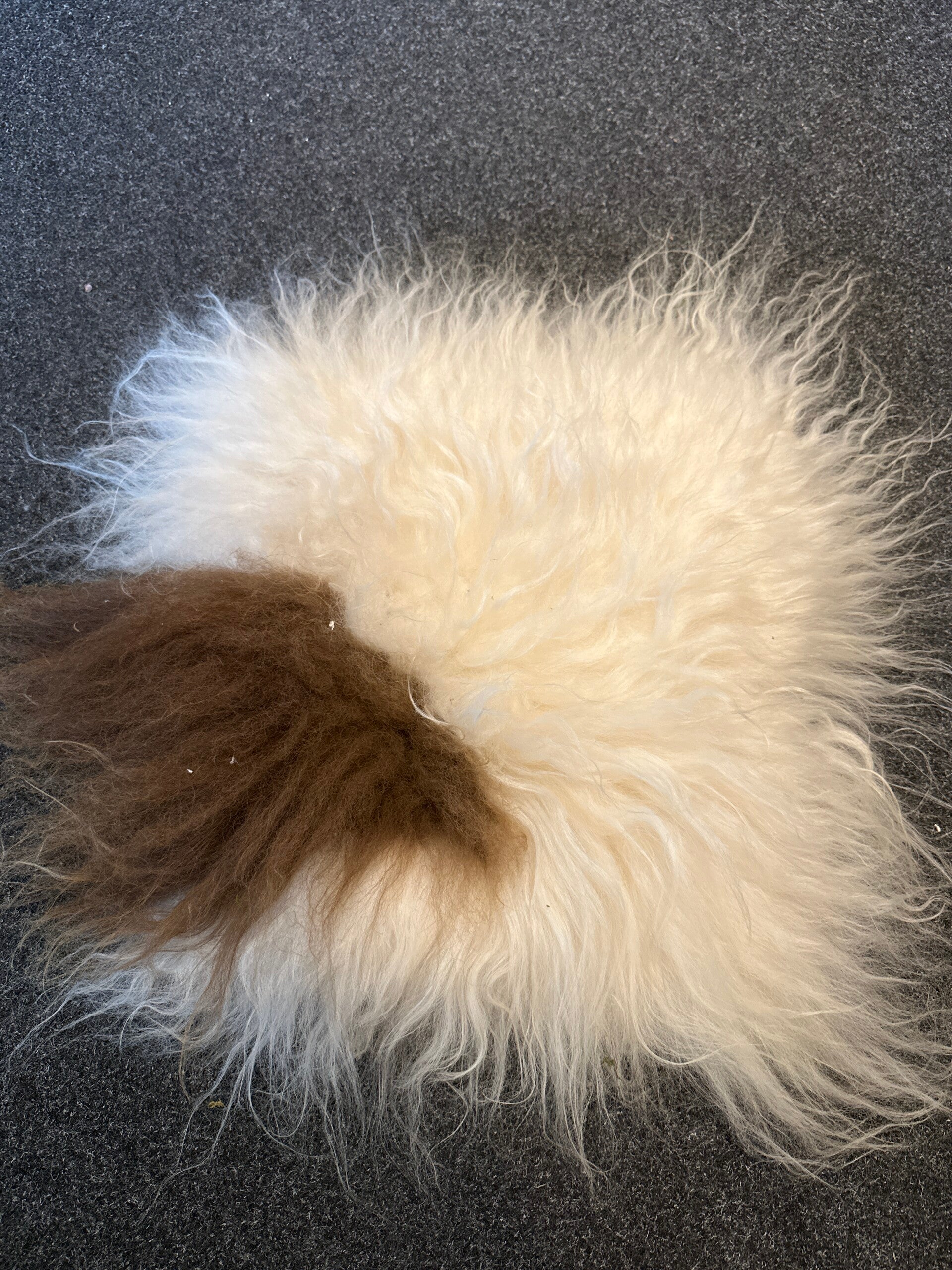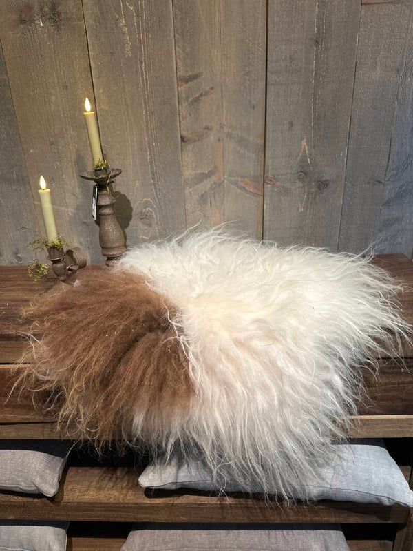 Stoere stoelpad in een mooie crème bruine kleur Stoelpad gemaakt van IJslandse langhaar. Leuk om over een kruk/bankje te leggen of om in een mooie grote schaal te leggen