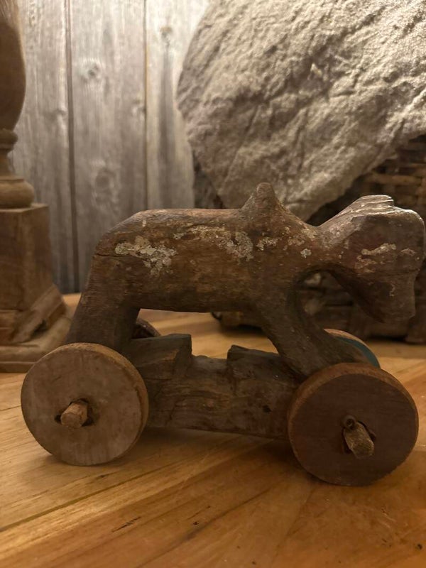 Oud houten speelgoed uit India met houten wielen prachtig om ter decoratie neer te zetten
